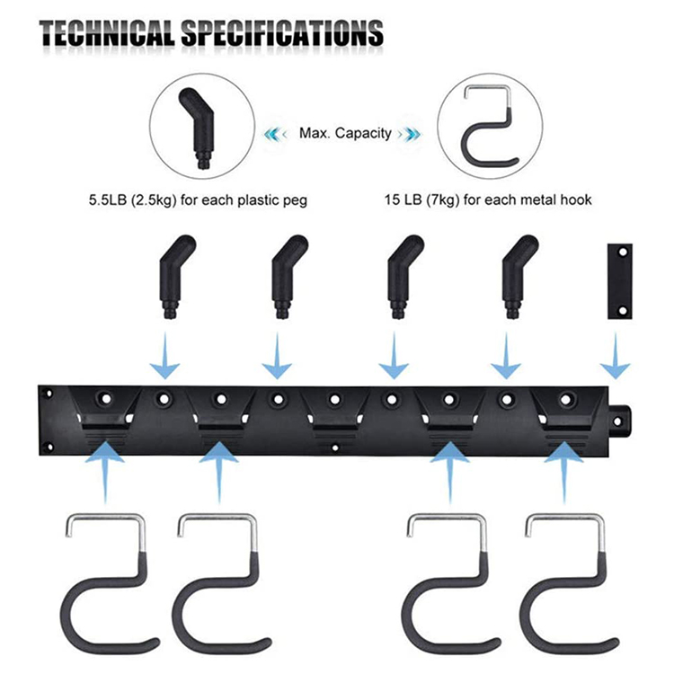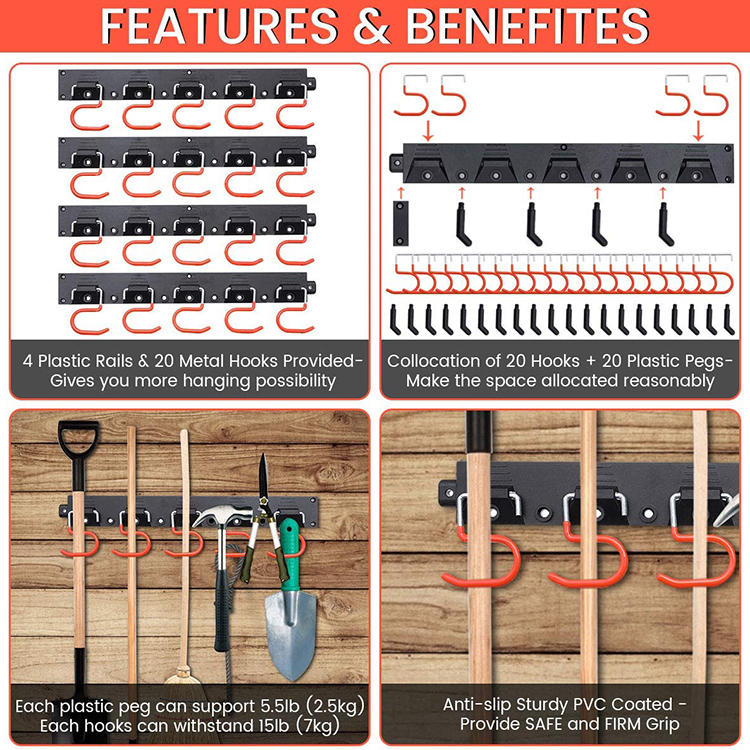 Suitable for organizing garage tools or garden tools and all kinds of tools. Such as rakes, shovels, push brooms, bikes, bags, towels, robes, keys, shirts, pants, umbrellas, rain boots and other hand tools, etc. You can use it to hang all the things you want to organize.