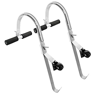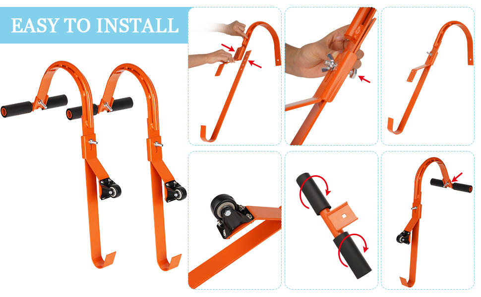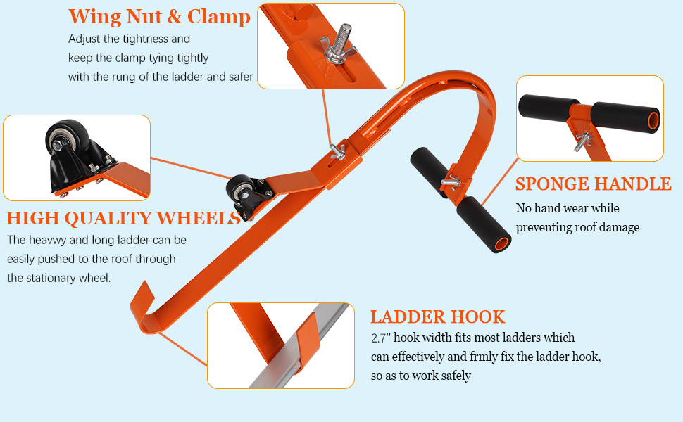 Ladder Hooks for Roof Necessary ladder accessories for roof work You must be looking for a reliable ladder storage hooks for your ladders, wheelbarrows and other unwieldy home appliances. Then this hanger/hook is your best choice: To keep your floor tidy and organized; To reclaim valuable floor and shelf space; To solve the storage with a minimum of wall space; To hanger the ladder, wheelbarrows and other obstacles firmly on the wall; To lift and lower items easily; No fear of falling over or young kids pulling it down.