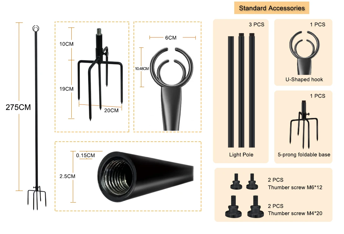 JH-Mech string light pole is made by our patent. The difference from others string light pole is that its material is made of waterproof thickened galvanzied steel with high quality black powder coating. And the string light pole is very strong, the bearing capacity is stronger than others, will not be bent.The Big 5-Prong Fork design is wider and longer than others, even if you go out to travel and use it outdoors, it will not be easily fall by the wind. It has three installation methods, which can be installed in any scene you want to install, even on the concrete floor.