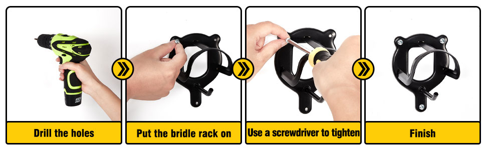 EASY TO INSTALL There are pre-drilled holes on the bridle rack and come with mounting screws in the package. Just drills holes on the wall then you can install directly without buying extra screws. Save your time and money.