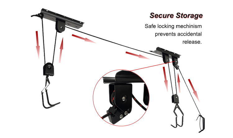 Supporting up to 100 lbs, our bike rack garage easily and securely lifts your investment. Smart auto-lock mechanism prevents accidental release, while padded hooks protect the frame.