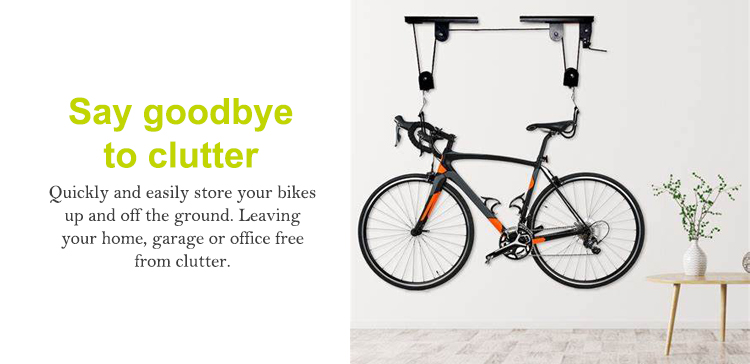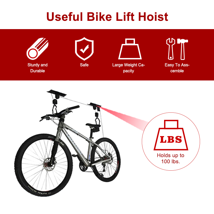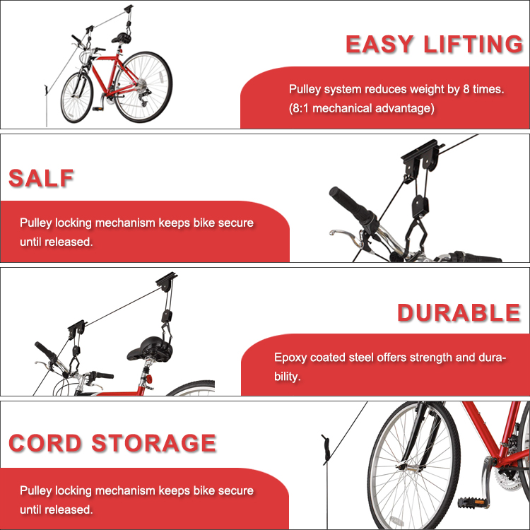 The garage bike lift is designed to mount your bike out of the floor by hanging it on the ceiling when it’s not used, and it can save a lot of space for your garage.