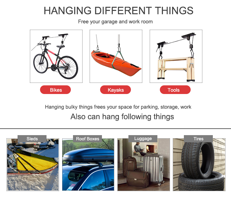Hanging bikes from ceiling is an ideal and perfect way to save space for garage. Storing your kid’s cycle or your mountain bike without taking too much space, its mounted system also allows heavy duty pulling not just from bicycles, but kayaks, extension ladders, and other gears as well. Tidy and organize your home trailer and storage room in an instant with this multipurpose tool!
