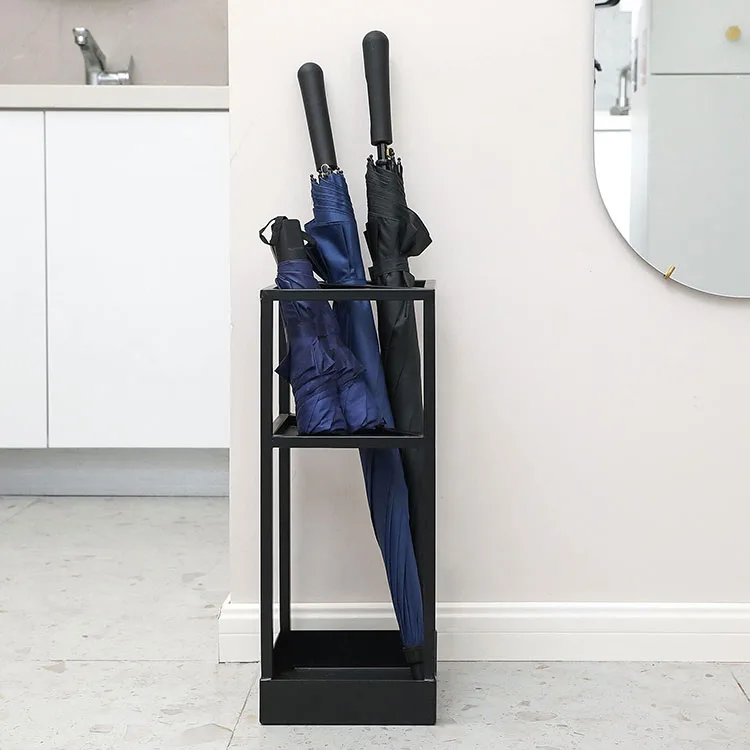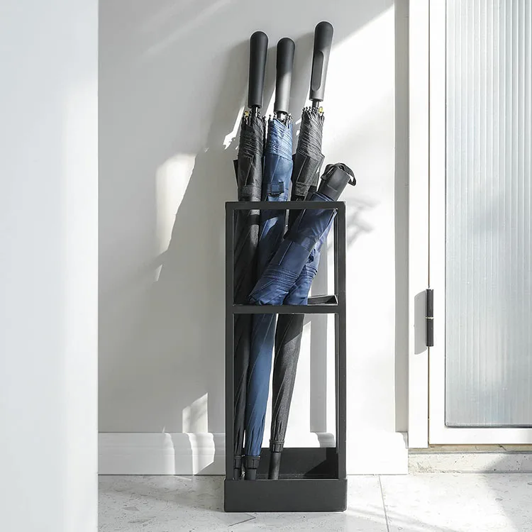 Featuring a durable metal construct and matte black powder-coated finish, this modern umbrellas holder rack keeps your tall umbrellas, smaller umbrellas, or walking sticks neatly organized and stylish. The compact size saves space while keeping your entryway or lobby clutter-free.