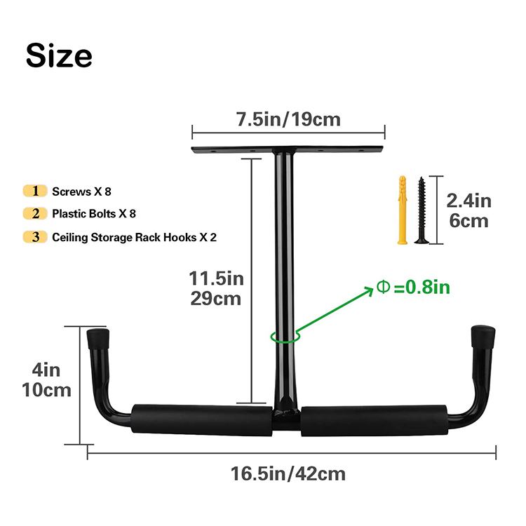 2 Set overhead storage hook measures L16-1/2"(42cm) x H11-1/2"(29cm) x Φ 3/4"(2cm) , which is the ideal size for you to store sundries.