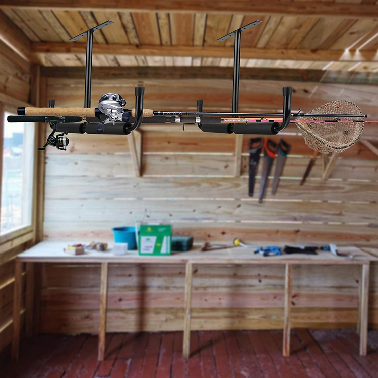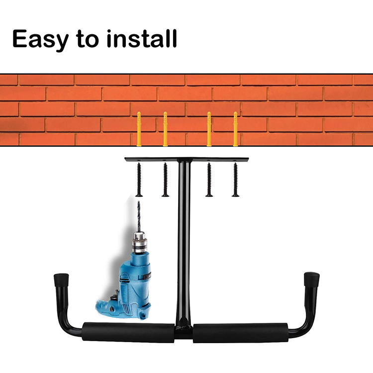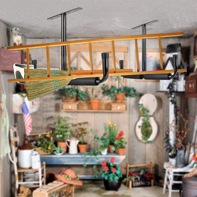 Our heavy-duty garage ceiling storage hanger is suitable for ladders, wood, shovels, brooms, fishing rods, tools, skis, pipes and some long items. Ideal for freeing up space in a shed or garage.