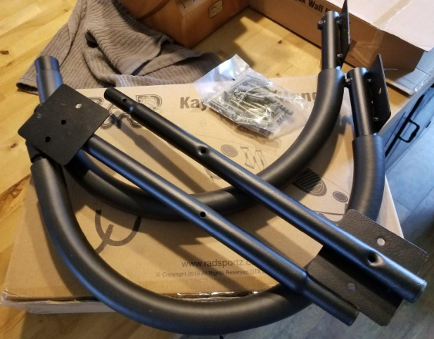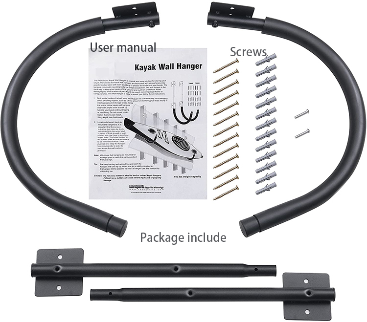 Kayak Canoe Surfboard Rack Package includes a pair (2 pcs) of hangers, installation hardware, and instructions. Hanger Design, screws and wall plugs type and instructions design can be customized with MOQ requirements.
