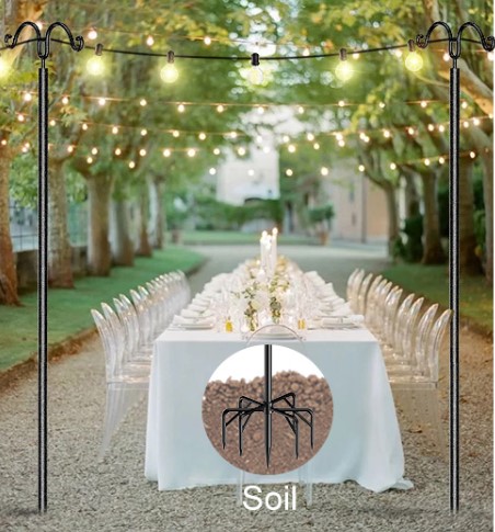 JH-Mech string light pole is made by our patent. The difference from others string light pole is that its material is made of waterproof thickened galvanzied steel with high quality black powder coating. And the string light pole is very strong, the bearing capacity is stronger than others, will not be bent.The Big 5-Prong Fork design is wider and longer than others, even if you go out to travel and use it outdoors, it will not be easily fall by the wind. It has three installation methods, which can be installed in any scene you want to install, even on the concrete floor.