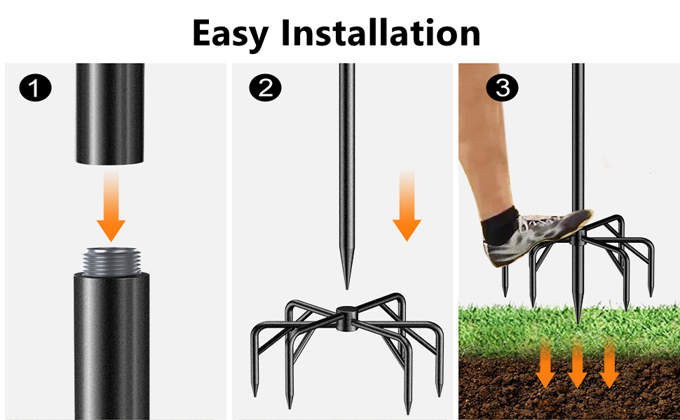 String light pole for outdoor is designed with screw-in joint to connect and a five long prongs base, which could insert soildeeply at 9". It will keep stability in the wind and collision after repeated tests, safe and secure.