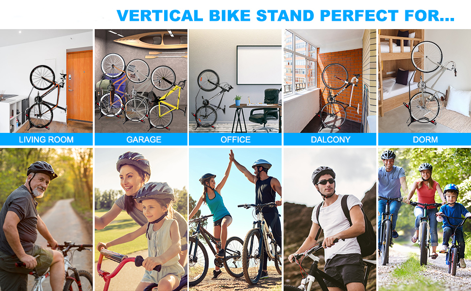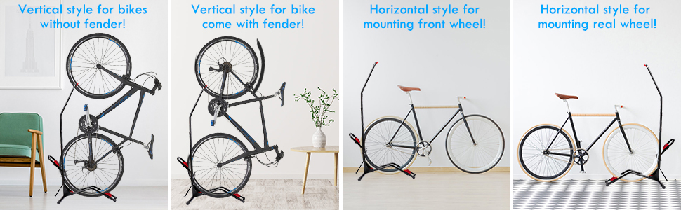 This vertical bike rack is designed to fit for 20"-27"mountain bikes, road bikes, women bikes, kids bikes and nearly all bikes , that the wheelbase within 1140 mm. And It's easy to put the bike on this bike stand.