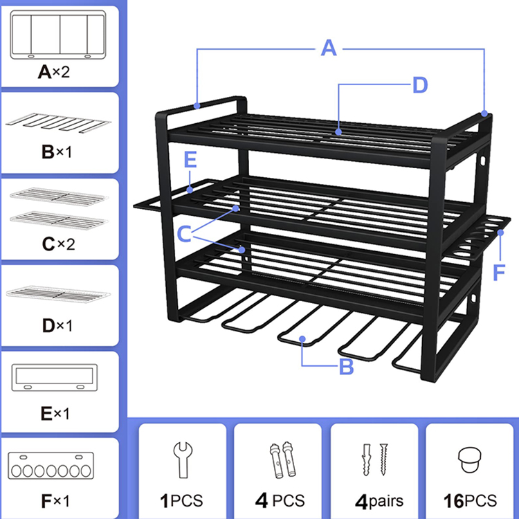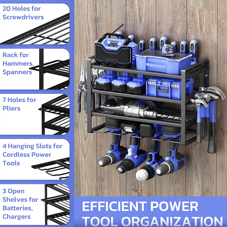 This 4-layer power tool organizer includes 1 tier of 4 hanging slots for power drills or impact drivers, 3 tiers of open shelves for battery packs, chargers, drill storage box, 20 screwdriver holes of different sizes, 7 plier holders and 1 hammer holder. Heavy Duty Metal Tool Shelf is great for people with multiple drills, impact drivers, batteries and charging.