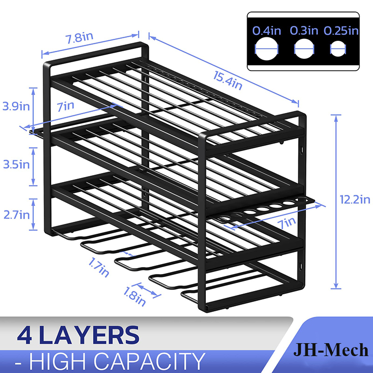 JH-Mech Tool Storage Organizer Holder 4-Layer Widened Frame Black Powder Coated Metal Power Tool Storage Organizer Wall Mount